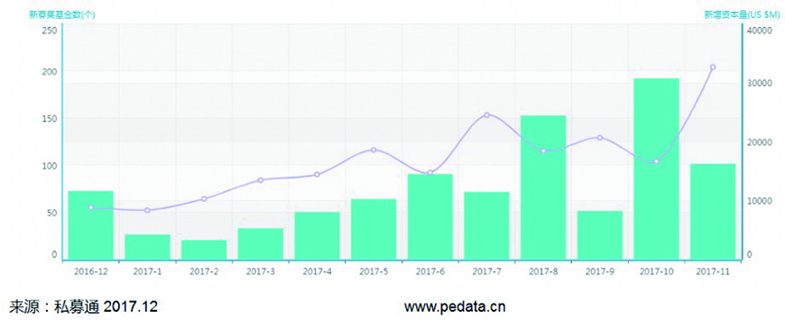 一、募资:2017年11月VC/PE市场持续升温,新幕基金数量均成倍增长