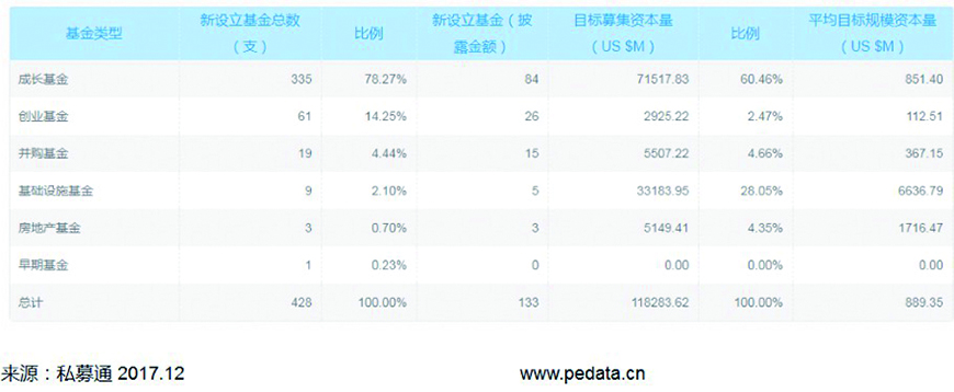 从基金类型来看,2017年11月新募集的有204支基金中,有190支基金披露募资金额,共募集资金161.99亿美元。其中当属成长基金最多,共有121支,占新募集基金数的59.3%,披露募资金额的有108支,募集资金103.8亿美元;创业基金58支,募资金额18.43亿美元;并购基金18支,募集资金13.22亿美元;基础设施基金5支,募资金额18.89亿美元;房地产基金2支,募集资金7.65亿美元,且平均募集资金最高,达3.83亿美元。