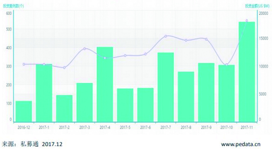 二、2017年11月VC/PE市场投资金额环比大幅增长