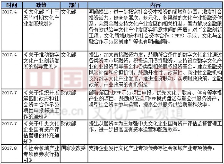 其中,促进优秀的文化企业进入资本市场也越来越成为政策支持的重点,文化产业与金融融合发展的政策环境持续利好。在国家层面,出台政策主要有: