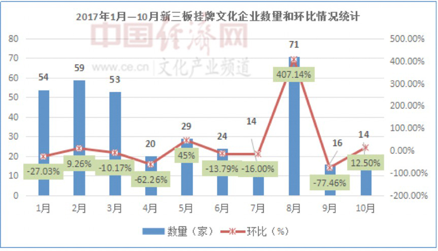 据统计,2015年,有358家文化企业挂牌新三板,2016年文化企业挂牌新三板高速增长,全年共有818家文化企业挂牌新三板,增幅高达到128.49%。进入2017年,虽然文化企业挂牌新三板的热度不减,截至2017年10月数量达到354家,但与2016年相比我国文化企业挂牌新三板的数量大幅下降。