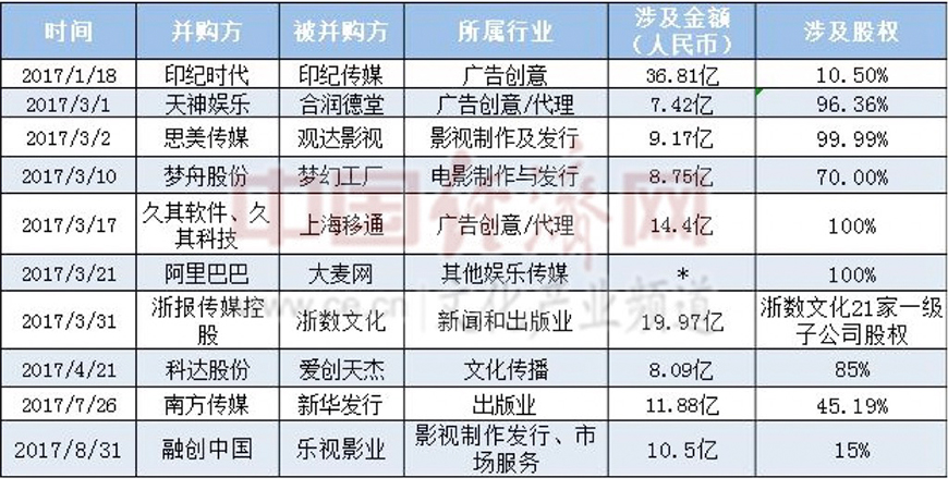 除去没有对外公布投资数额的并购之外,2017年1至11月文化产业领域所发生的并购案例也是很大亮点。