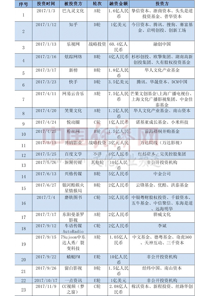 2017年整个文化产业领域,融资案例中高居榜首的是乐视网获得融创中国战略投资60.4亿人民币,第二位的新潮传媒、上海麦克风文化传媒有限公司旗下蜻蜓FM分别获投人民币10亿元。其中,蜻蜓FM本次融资刷新互联网音频领域的单轮融资记录。