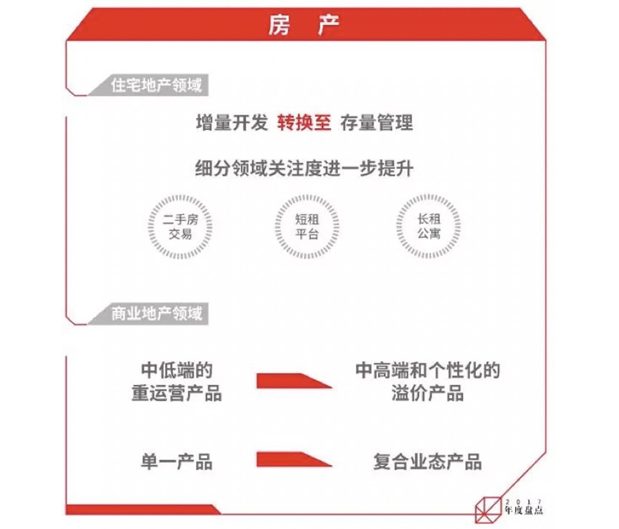 住宅地产领域,从增量开发到存量管理的转换趋势愈发明显,二手房交易、短租平台及长租公寓等资产管理细分领域关注度进一步提升。尤其是长租公寓行业,在消费升级大潮和各地租售同权的政策驱动下,成为2017年最大的风口,地产开发商、酒店运营商、房产经纪、创业者等各种背景的玩家纷纷进入市场,快速跑马圈地。多家长租公寓企业会陆续完成大额融资。