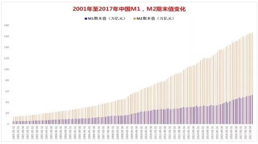 第一个维度数据:2001年末,广义货币(M2)余额15.83万亿元;2005年末,M2余额29.88万亿元;2007年末,M2余额40.34万亿元;2010年末,M2余额72.59万亿元;2012年末,M2余额97.41万亿元;2014年末,M2余额122.84万亿元;2015年末,M2余额139.23万亿元;2016年末,M2余额155.01万亿元;2017年11月末,M2余额167万亿元。
