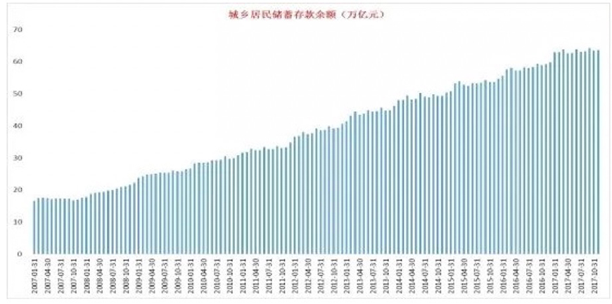 第二个维度数据:2007年1月,居民储蓄存款余额16.47万亿元;2010年末,居民储蓄存款余额30.84万亿元;2012年末,居民储蓄存款余额40.62万亿元;2015年末,居民储蓄存款余额54.61万亿元;2017年11月末,居民储蓄存款余额63.6万亿元。