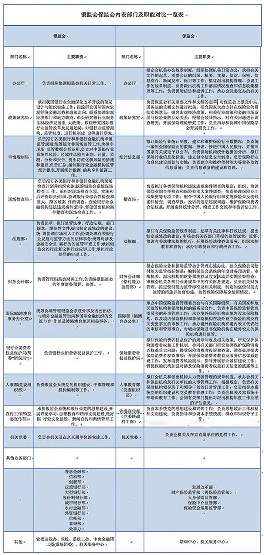 针对目前银监会、保监会内设部门和主要职责对比,界面新闻初步梳理如下: