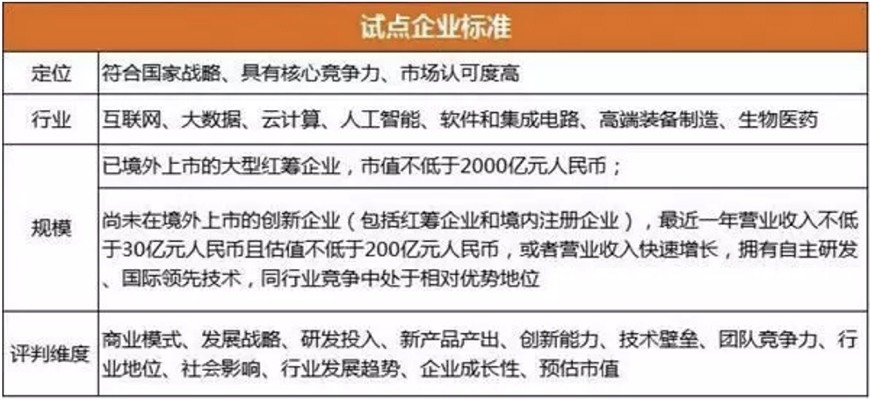 《意见》划定了试点对象及选取机制。试点主要针对少数符合国家战略、具有核心竞争力、市场认可度高,属于互联网、大数据、云计算、人工智能、软件和集成电路、高端装备制造、生物医药等高新技术产业和战略性新兴产业,达到相当规模的创新企业。
