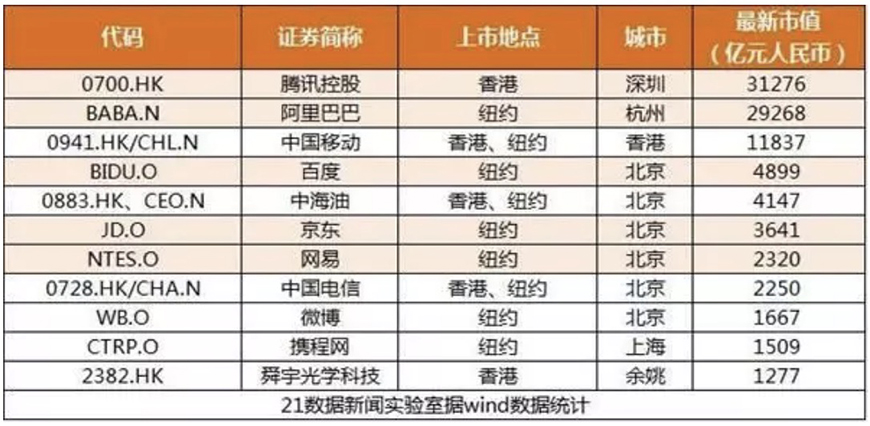 据21数据新闻实验室统计,截至2018年3月30日,已经上市的中国概念股,按2000亿人民市值标准,剔除中石油等已经在国内上市的企业有8家。