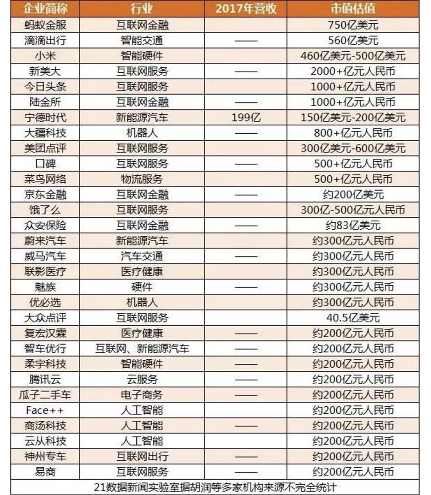 此外,21数据新闻实验室在综合了Wall Street Journal、Dow Jones Venture source、CB Insights、胡润研究院等几家相对权威并具备一定影响力的机构的统计数据之后发现,截至2018年3月,中国大陆境内被国内外投资者和投机机构认可的“独角兽”公司大约有30家。