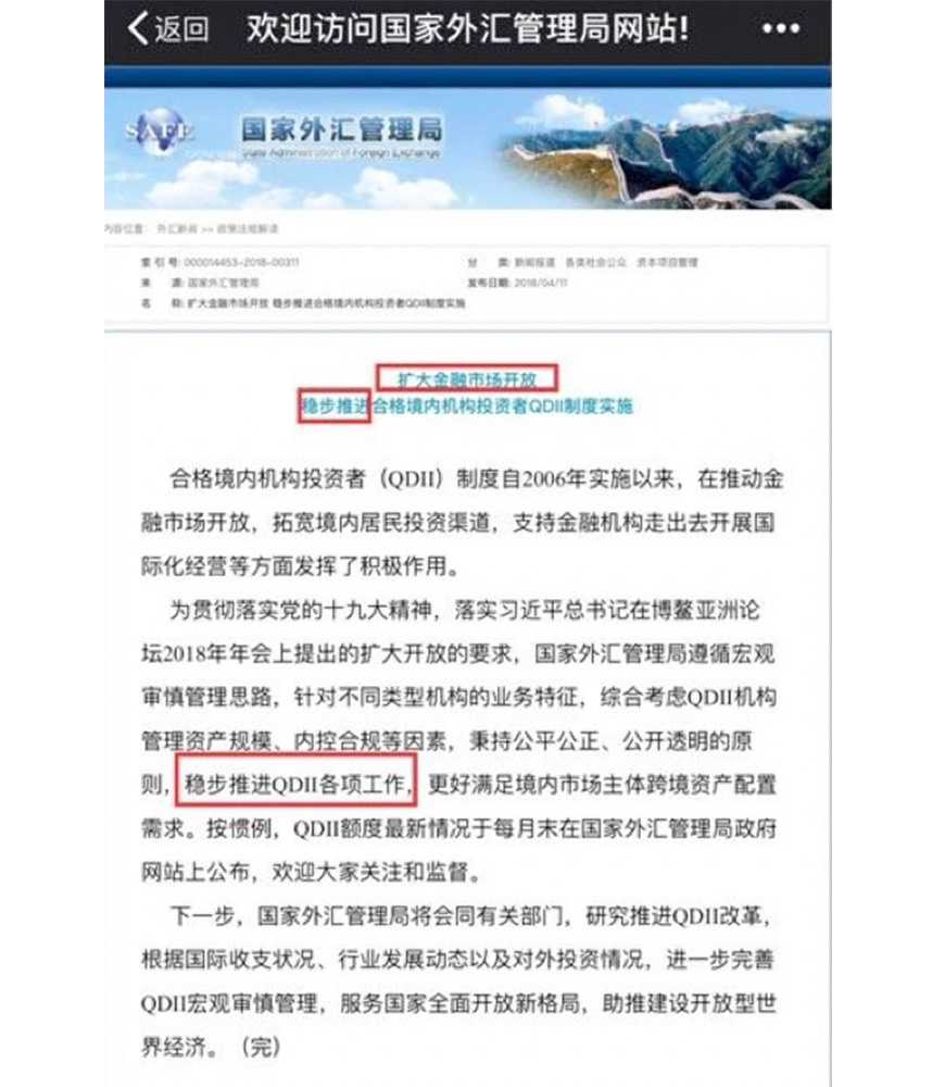 4月10日,中国国家主席宣布四项扩大对外开放的重大举措。4月11日,央行行长易纲对2018年的金融业开放举措做出具体安排。紧接着,外管局官方罕见发声:标题为:扩大金融市场开放 稳步推进QDII制度实施。
