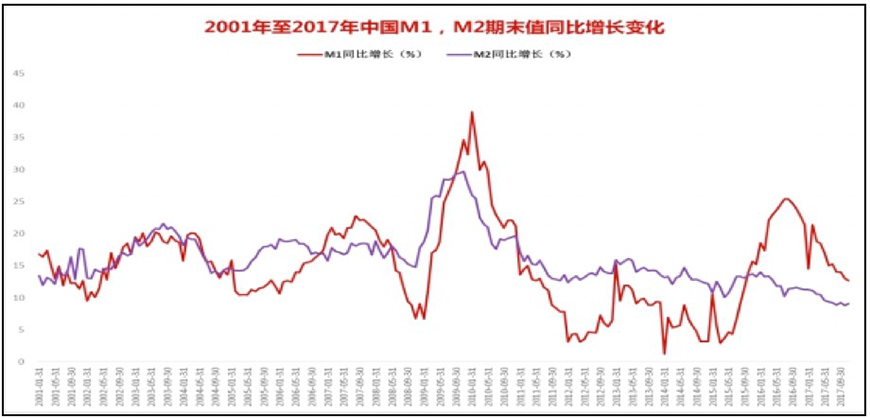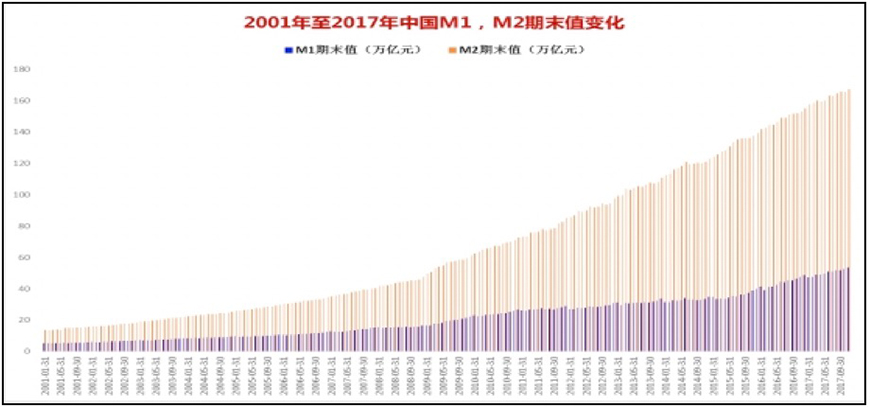 图表 1:2001年至2017年末中国M1、M2期末值变化