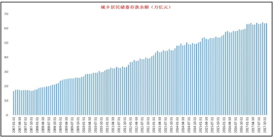 第二个维度数据:2007年1月,居民储蓄存款余额16.47万亿元;2010年末,居民储蓄存款余额30.84万亿元;2012年末,居民储蓄存款余额40.62万亿元;2015年末,居民储蓄存款余额54.61万亿元;2017年11月末,居民储蓄存款余额63.6万亿元。