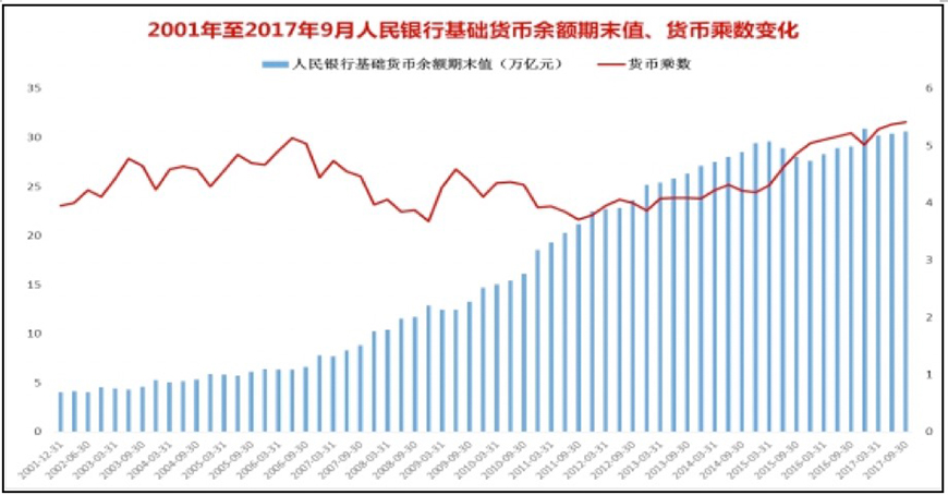 图表 5:2001年至2017年9月人民银行基础货币余额期末值、货币乘数变化