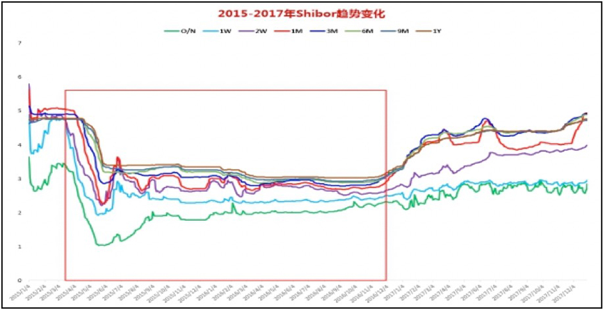 2015年上半年,各个期限银行间资金价格快速下行。2015年下半年至2016年前三季度,短中长期限Shibor走势稳定,长期维持低水平。2016年3月1日,央行普遍下调金融机构人民币存款准备金率0.5个百分点。对此举政策,央行给出的解释是,保持金融体系流动性合理充裕,引导货币信贷平稳适度增长,为供给侧结构性改革营造适宜的货币金融环境。