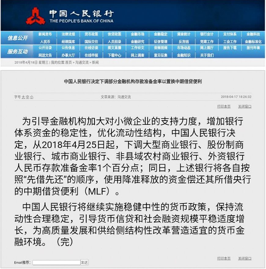时间走到2018年4月17日晚间,中国人民银行决定,从2018年4月25日起,下调大型商业银行、股份制商业银行、城市商业银行、非县域农村商业银行、外资银行人民币存款准备金率1个百分点;同日,上述银行将各自按照“先借先还”的顺序,使用降准释放的资金偿还其所借央行的中期借贷便利(MLF)。