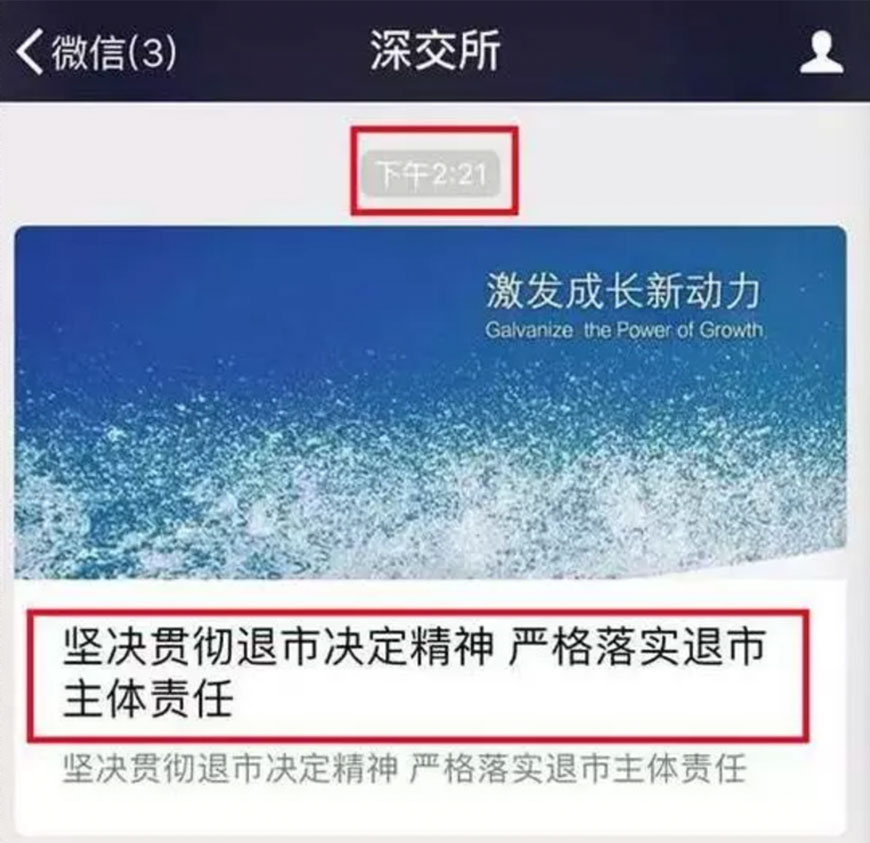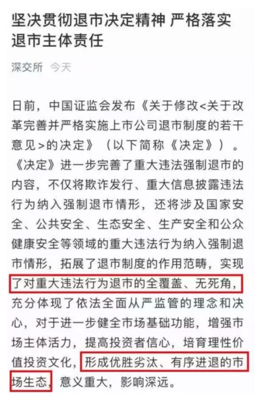 深交所周末加班在周日下午2点20分左右发布微信内容,其中,对于严重危害市场秩序,严重侵害群众利益,造成重大社会影响的重大违法公司,坚决做到“出现一家、退市一家”,不姑息,零容忍。